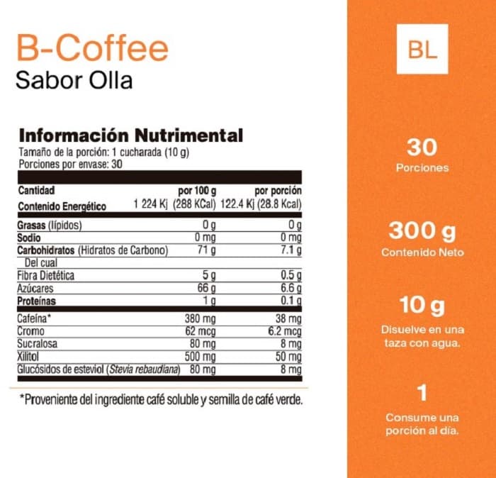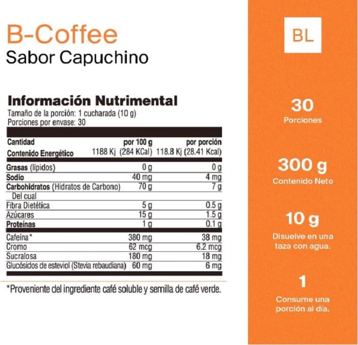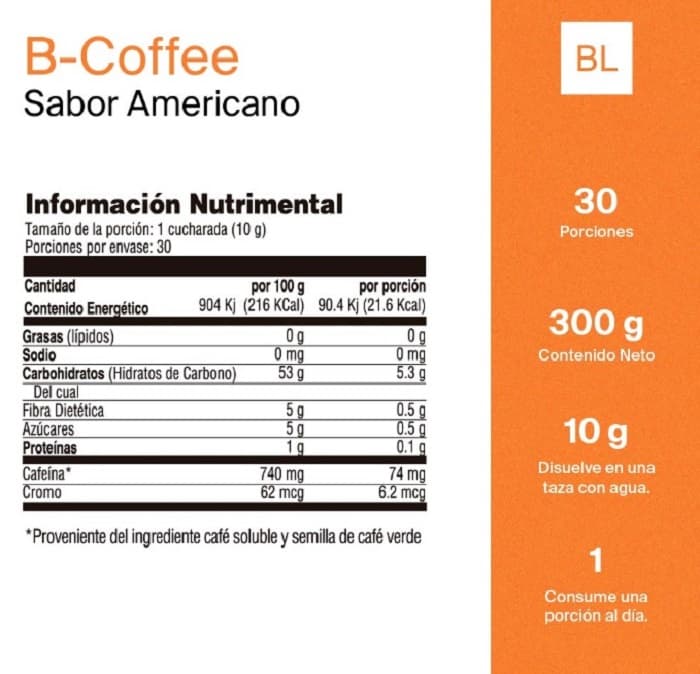 B-Coffee Bodylogic, es un delicioso café de olla, americano o capuchino soluble, con semilla de café verde, hongo shiitake, cascara de naranja agria e inulina de agave. Contiene polinicotinato de cromo que ayuda a la perdida de grasa.