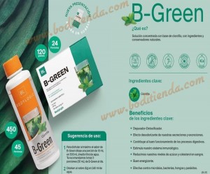 B-Green sobres es una clorofila pura, que ademas contiene aceites esenciales de hierbabuena, menta y limón para un sabor mas agradable . B-Green es 100% natural, sin conservadores artificiales y ahora mas practico en sobres.