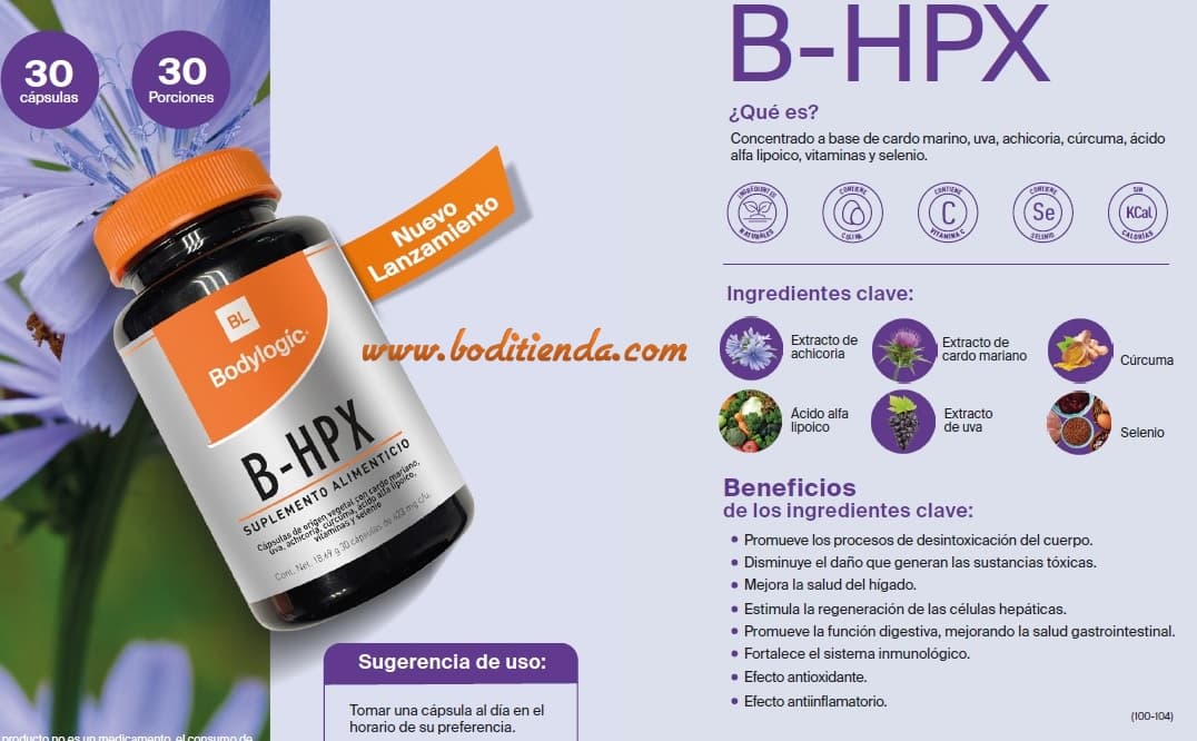B-HPX, es un concentrado de cardio mariano, uva, achicoria, curcuma, acido alfa lipoico, selenio y vitaminas. B-HPX Bodylogic sirve para desintoxicar el organismo, mejorando la salud del higado. Contiene cardio mariano, uva, achicoria, curcuma, acido alfa lipoico, selenio y vitaminas.