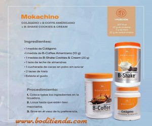 Combinar 1 medida de Colágeno Bodylogic, 1 medida de B-Coffee Americano, 1 medida de B-Shake Vainilla, 1 taza de leche de almendras 1 cucharada chica de cocoa en polvo natural sin azucar, hielo al gusto. Colocar todo en la licuadora y licuar hasta que esten bien mezclado, disfrutar.